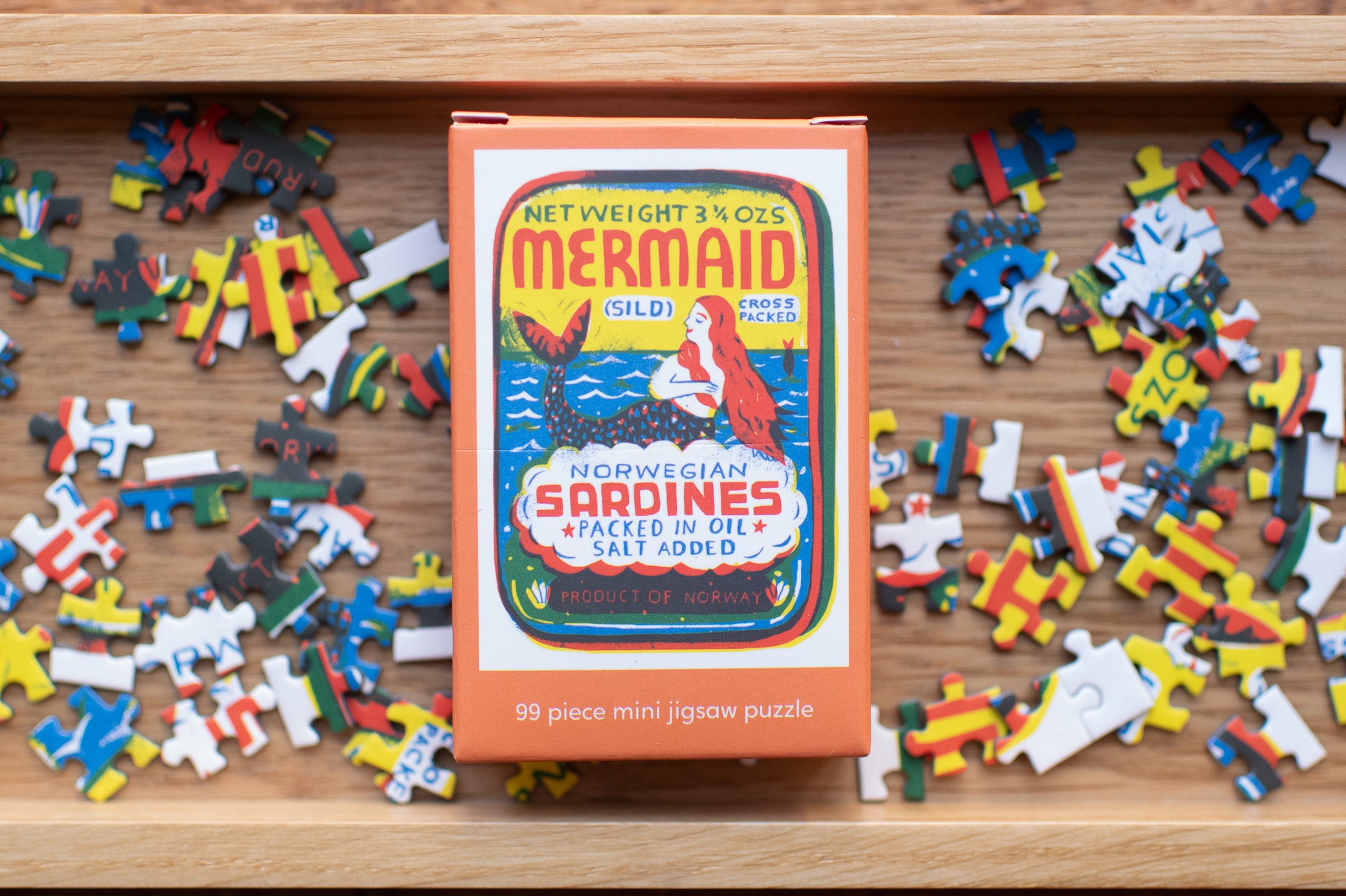 1,000 piece puzzle featuring illustrated tinned seafood by Natalia Yañez-Stiel - Made in the Netherlands, printed with vegetable-based ink using sustainably sourced high quality FSC paper and 100% recycled board.