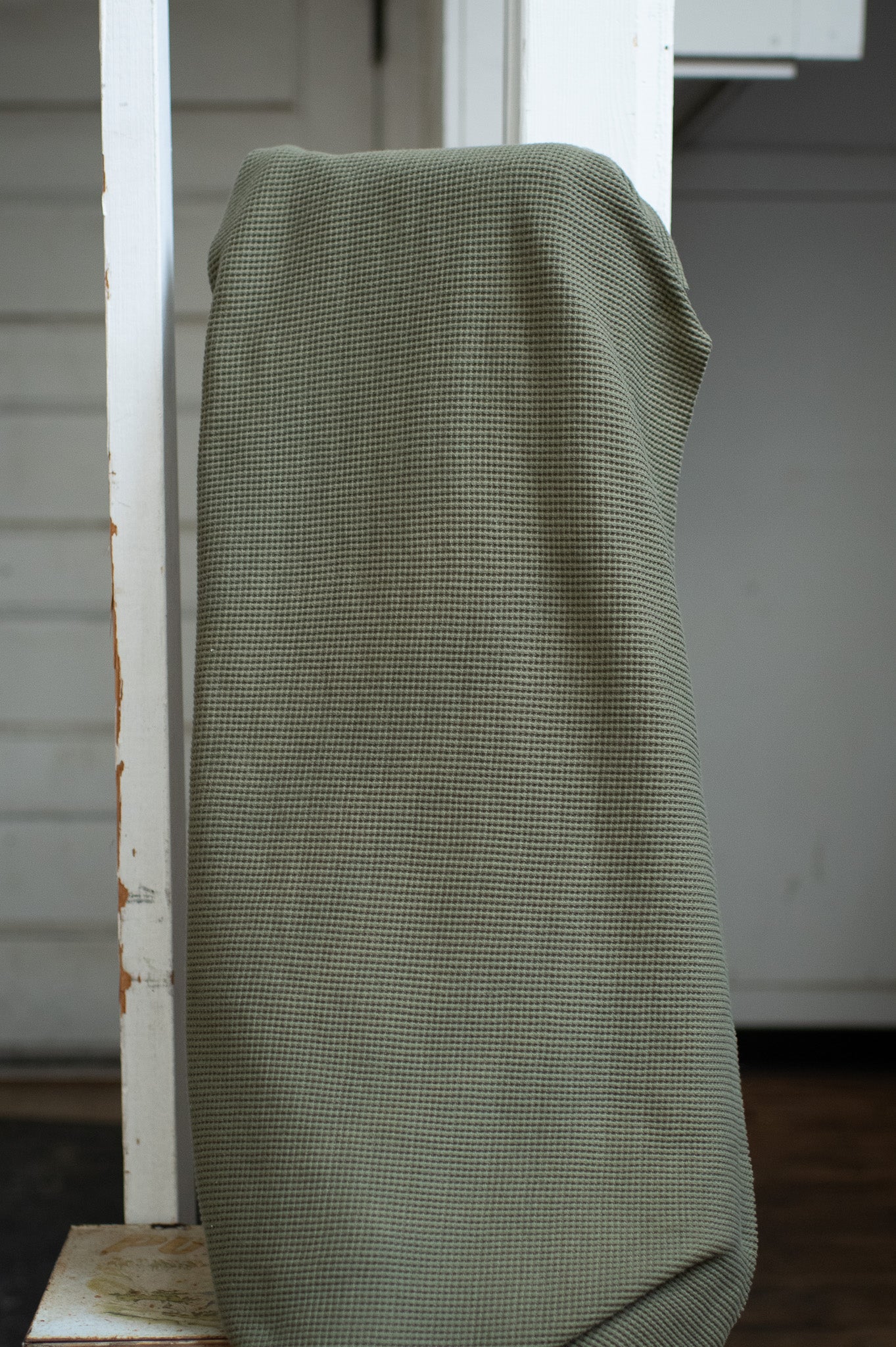 Green textured blanket draped over a white ladder indoors.