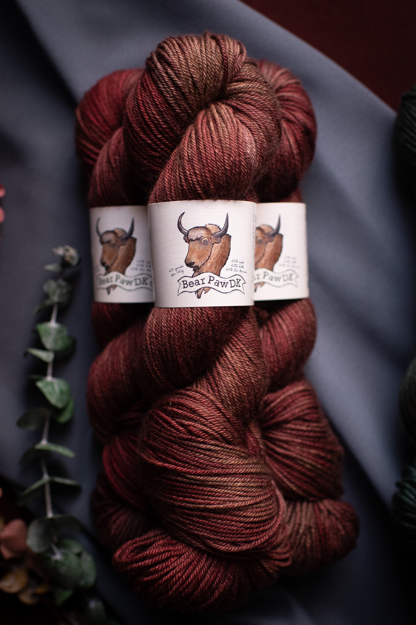 Designed to reflect the book’s themes, we dyed skeins of Bear Paw DK to invoke the feelings these retellings of classic Greek Mythology stories provoked in us.