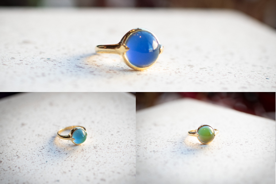 Feelings Ring // Gold plated brass ring, 10mm color changing mood stone, 'Feelings' engraved on the inside, the mood stone will discolor if exposed to water