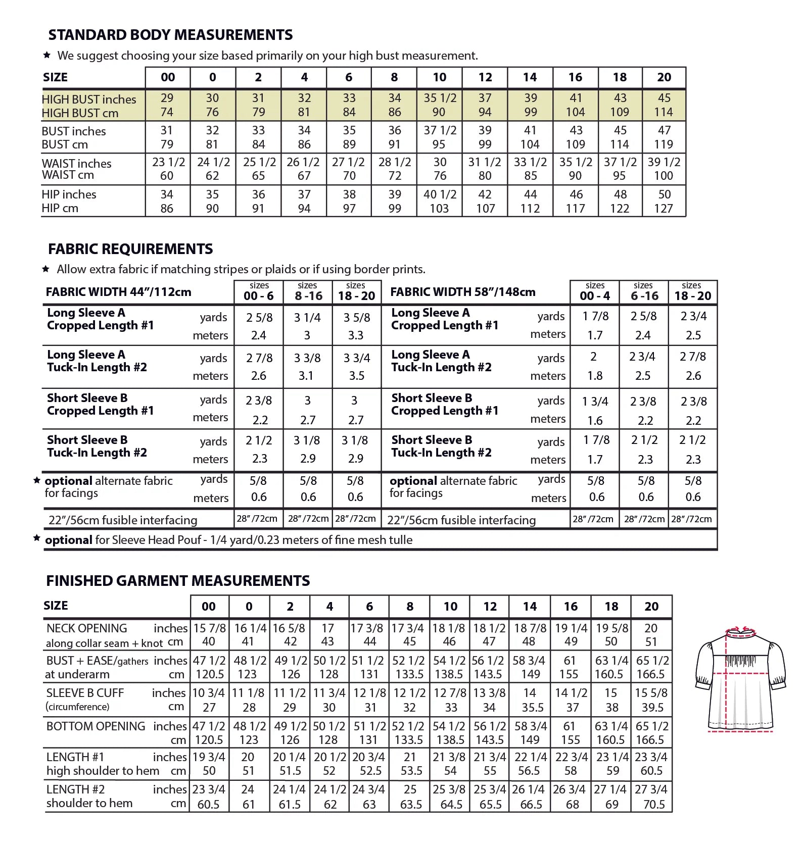 With all of its gathers, puffy sleeves and high collar, the Regalia still manages to look effortless and casual. The roomy fit of the bodice makes it so comfortable to wear. It pulls on over the head and ties at the back keyhole opening. It also features front and back yokes and a stand-up collar. There are two lengths and two sleeve designs to mix and match. Choose between a loose and flowy cropped hem to wear with high waist pants and skirts or a slightly longer tuck-in length blouse with an optional waist tie. The long sleeves (A) are gathered at the shoulder and narrow at the wrist while the short sleeves (B) are gathered at the shoulder and gathered into a cuff that lands just above the elbow.  You can add an optional tulle sleeve head pouf to add a bit of volume to your sleeves. The Regalia looks best when sewn in a light-weight, woven fabric such as cotton voile or lawn but it also looks lovely in linen. Just be aware that looser weave fabrics such as linen and gauze will result in a slightly looser fitting garment.