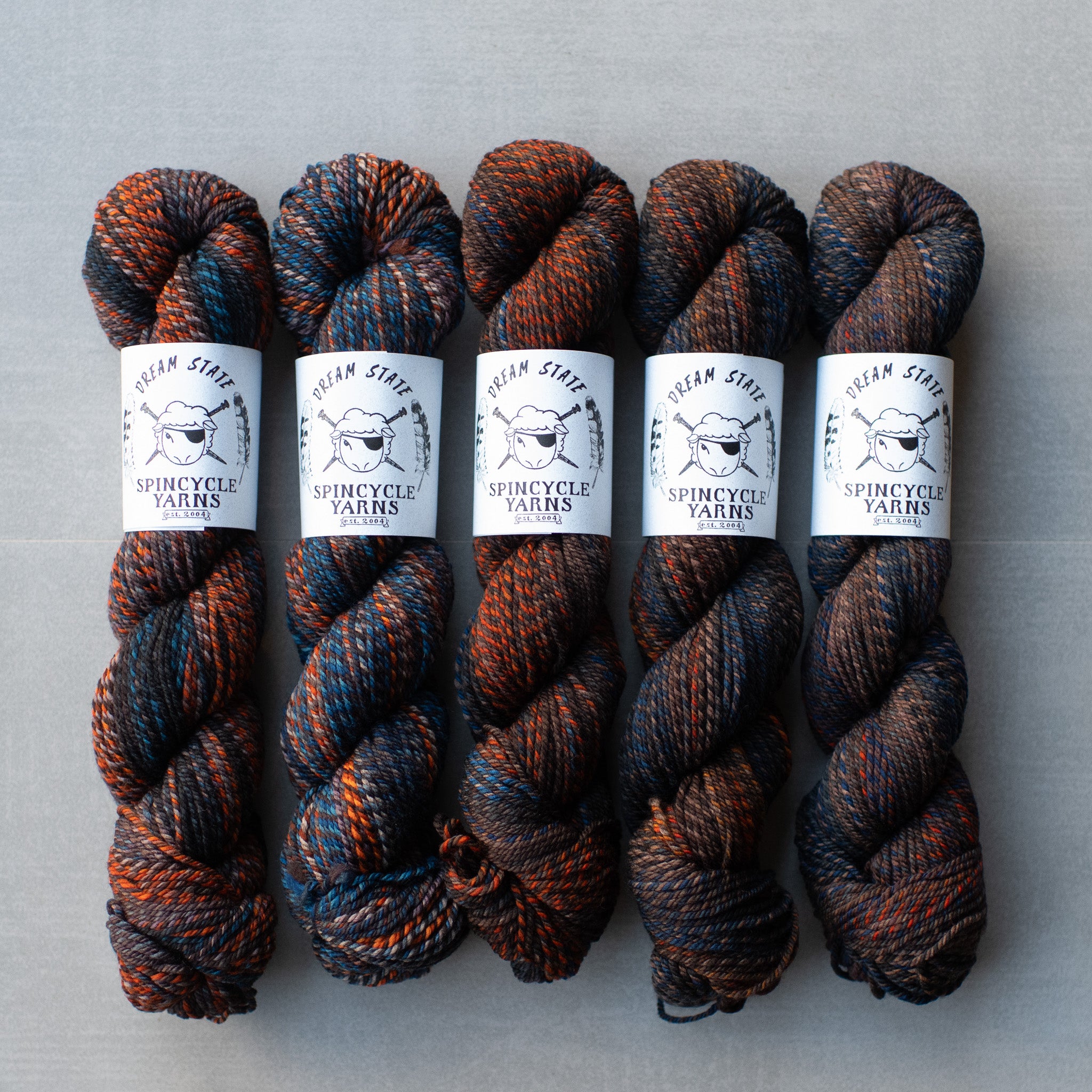 Dream State is just that, a dreamy little number rich with color and wooly goodness. 100% SW American Merino Wool. Worsted Weight, 150 yards per skein.