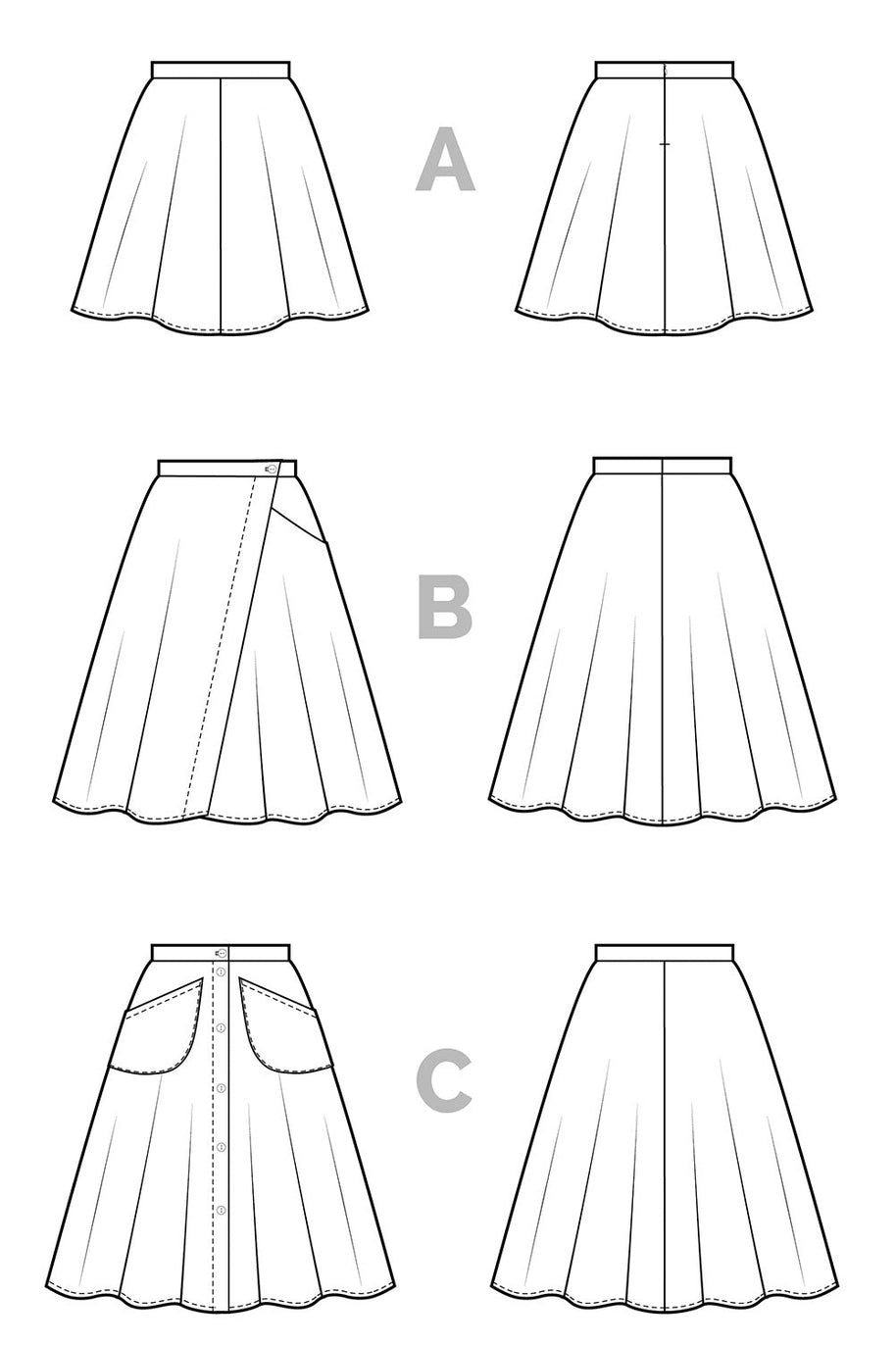 Available in above or below the knee lengths, the Fiore Skirt has three views. View A is a simple flared skirt with an invisible zipper at the back. View B is an asymmetrical wrap skirt with a single hip pocket. View C buttons up the front with curved patch pockets.