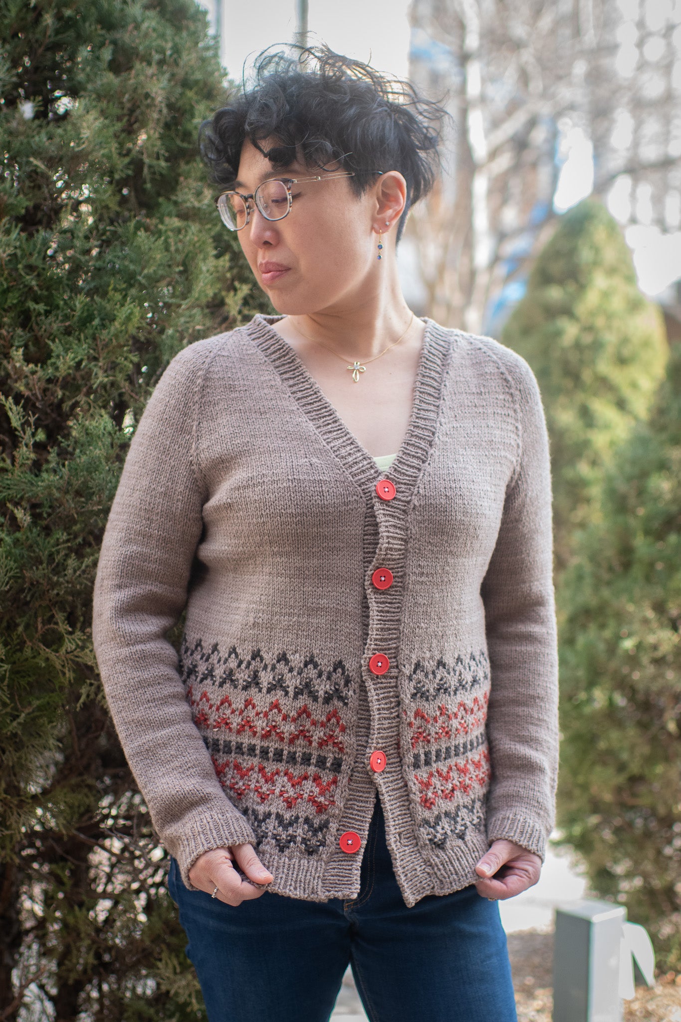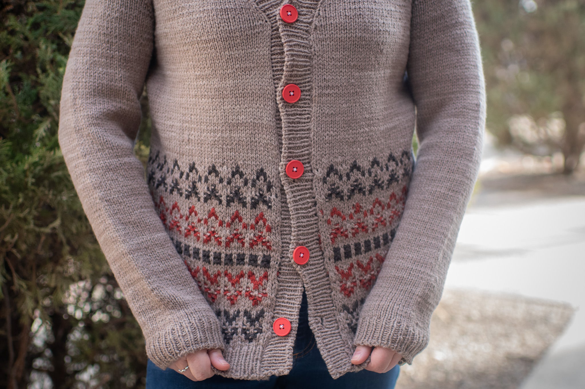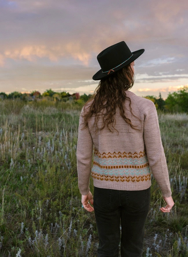 Seamlessly worked from the top down with classic raglan shaping and a gentle V-neck, this cardigan offers an easy, flattering silhouette made for everyday wear. Classic 1x1 ribbing at the cuffs, hem, and button band keeps the lines simple and timeless, allowing the fabric to speak for itself. A wide band of mosaic colorwork flows across the lower body, echoing the shifting patterns of light on water. The details are not only wearable art, but a wonderful way to learn and hone the mosaic colorwork stitch technique.