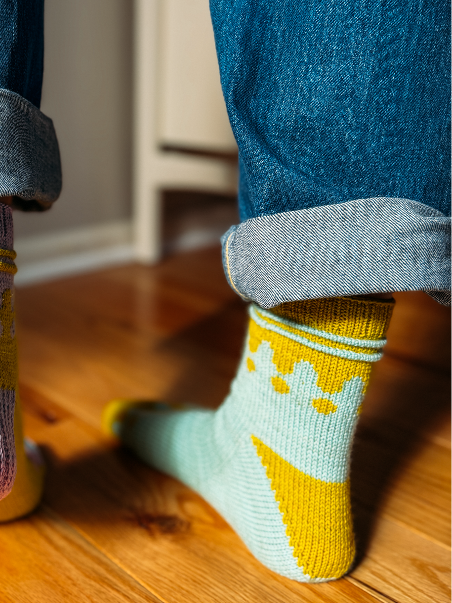 Andrea Mowry’s Ooey Gooey Socks are finally here! Whether you’ve already knit the sweater and cowl, you’re a devoted sock knitter, or you’re just looking for a fun, bite-sized project with that signature Ooey Gooey motif and fun welts, these socks are it! The Ooey Gooey Socks are quickly becoming our new favorite sock pattern as it features instructions for both top down and toe up construction!